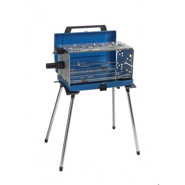 Cooking and grilling at the same time – no problem with the suitcase gas grill. Three flames serve as hotplates at the top while the food is grilled on the spit or on the grill underneath. Versatile and universally applicable. The heat during grilling comes from above, so fat and marinades do not burn. The grease drip tray is dishwasher-safe. All parts are transported space-saving in the housing. With sturdy carrying handle.