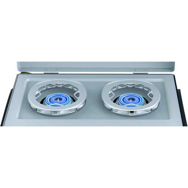 Portable Xcelerate two flame cooker 600SG with 2 x 2200 Watt. For standard gas cylinders, incl. hose (80cm). Modern two-flame cooker from the 600 Xcelerate series with innovative technology for improved cooking performance. Robust lacquered steel lid with chrome handle. The Xcelerate has a strong burner which halves cooking time in the wind.