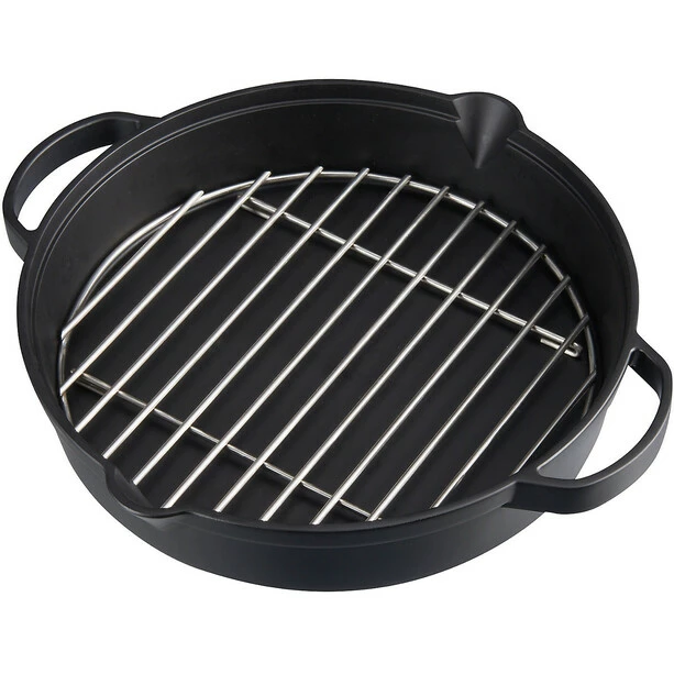 The cast iron pan with the integrated stainless steel grid offers an endless variation of uses. Roast larger pieces of meat or even a whole chicken. Remove the grate and prepare a stew or a crumble cake. The pan has high walls to minimise splattering and thus preserve the juices for preparing sauces. The side spout allows for drip-free pouring. Large handles provide extra stability when lifting a full pan.