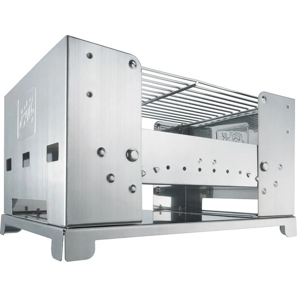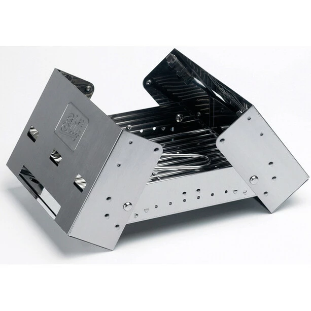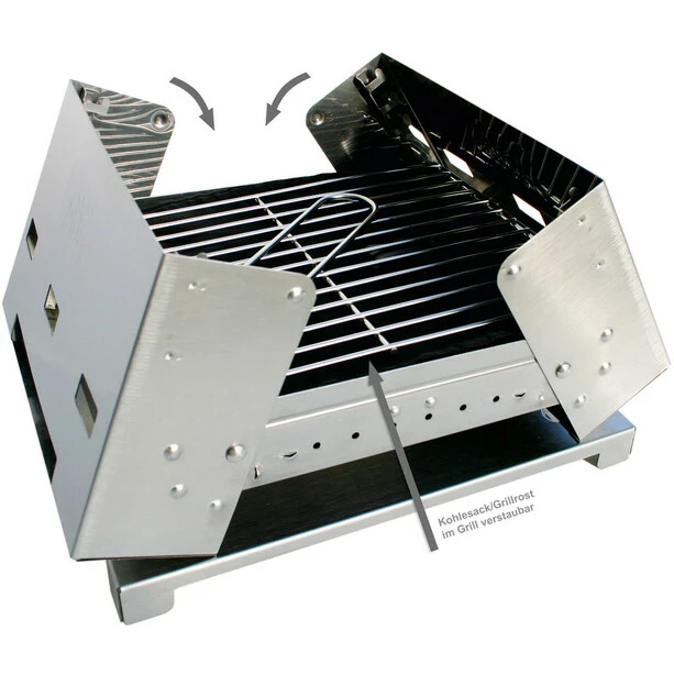 A cunning stainless steel, height adjustable grill for underway with water resistant charcoal bag! Copied from the famous Esbit cookers folding function and design and with certainty the perfect companion for mobile grilling. Everything at hand and nevertheless compact with the folding sides. No mess before or after grilling, then not only the coal can be packed away but the complete grill too. With pack sack.