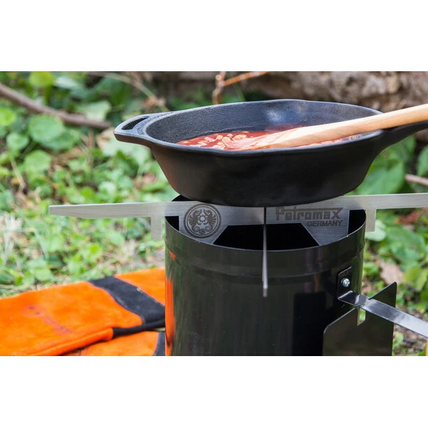 With the Petromax Fire Stand, you can use the heat over a chimney starter. Both parts can be connected in the middle. While charcoal and briquettes are starting to burn, there is enough heat for frying the first ingredients in a pot or a pan or for preparing delicious beverages. So no heat is lost unused. Moreover, you can also use the fire stand as a traditional, practical trivet for pots and pans. The cross-shaped stand fits on barbecue starters or chimney starters with a diameter of 0.57 to 0.63 in (14.5 to 16.5 cm) and 0.75 to 0.98 in (19 to 25 cm). After assembling the parts, join the fire stand to the chimney starter thanks to the ready-made cut-outs.