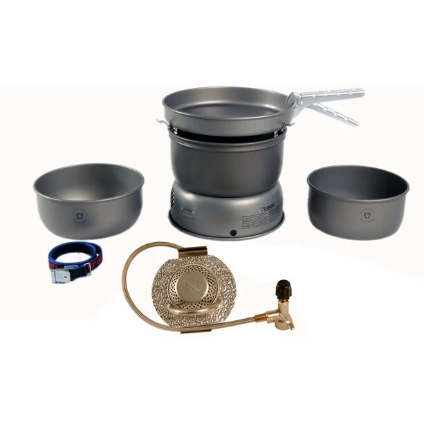 The 25 series includes the larger models, which are suitable for groups of 3-4 people. These excellent family sets consist of larger cookware and a wider frying pan. With the holders folded up, the cooker can be used with larger pots from the Trangia range.